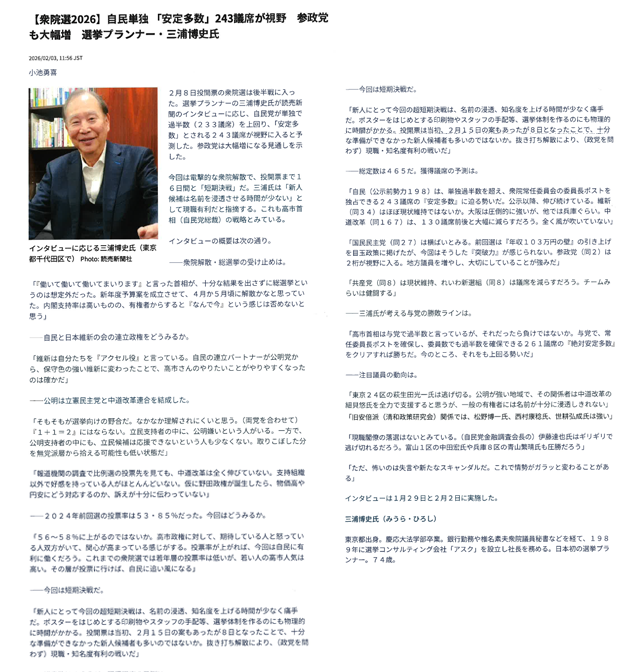 | DOW JONES 読売新聞 Pro(2026年2月3日) | Click | 選挙関連記事 |